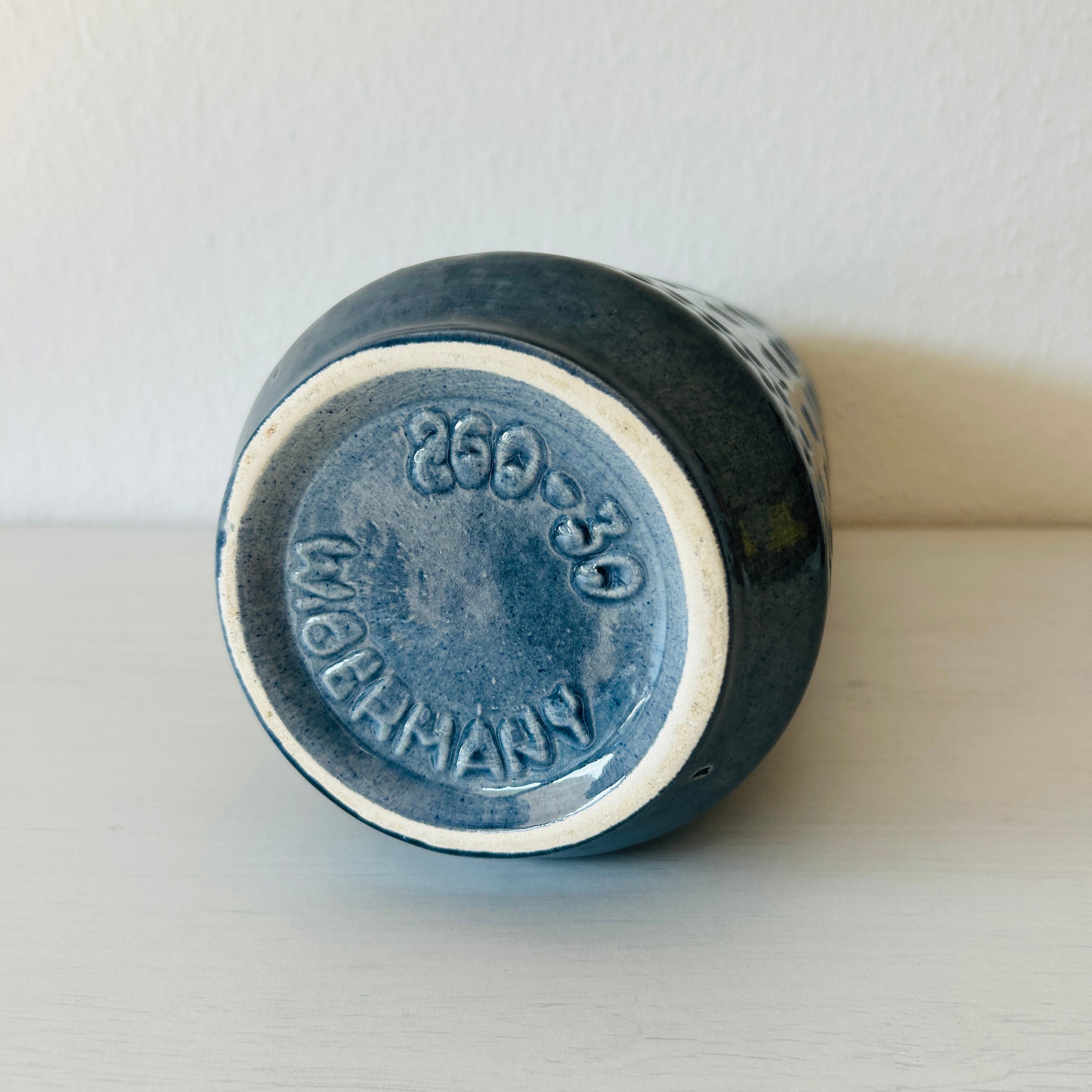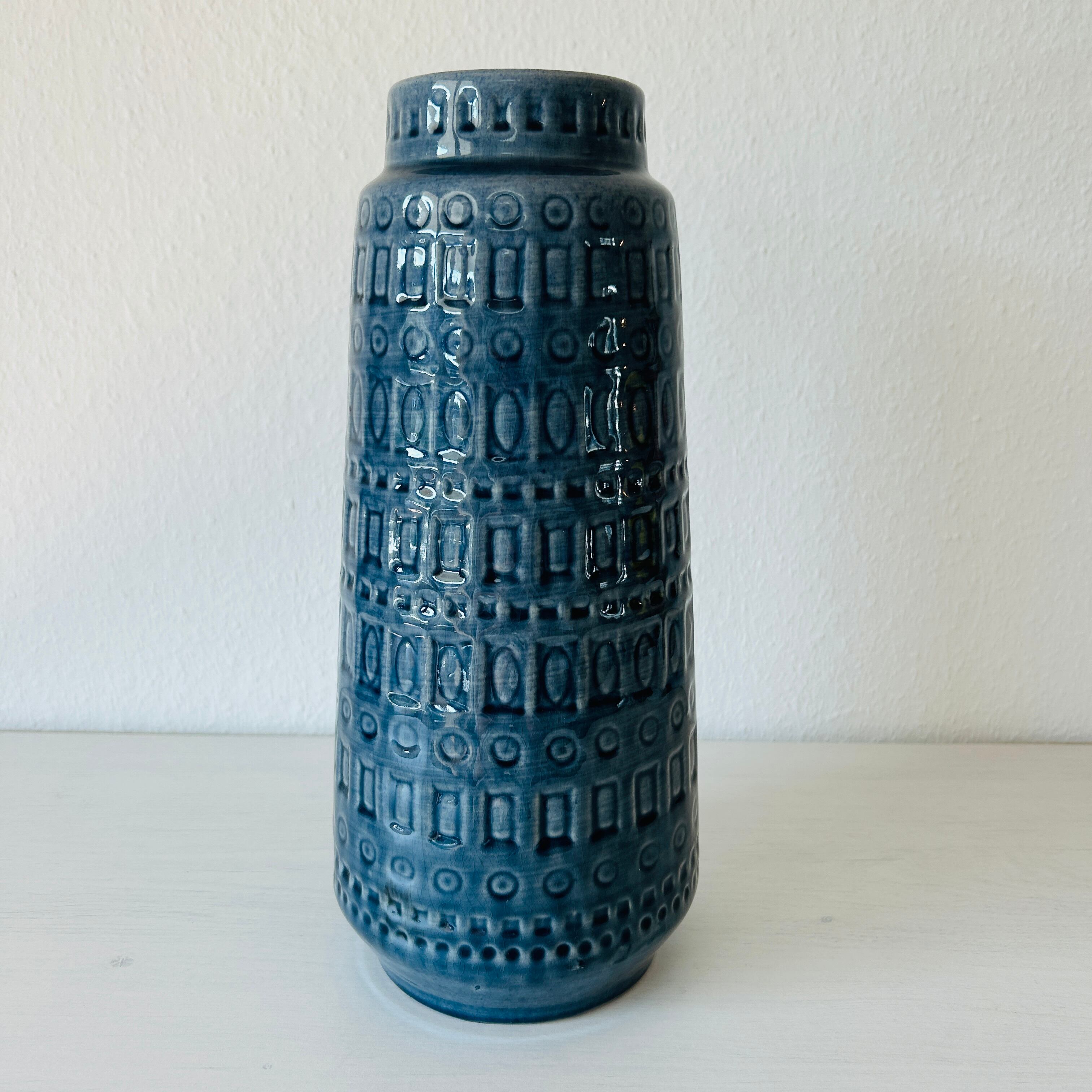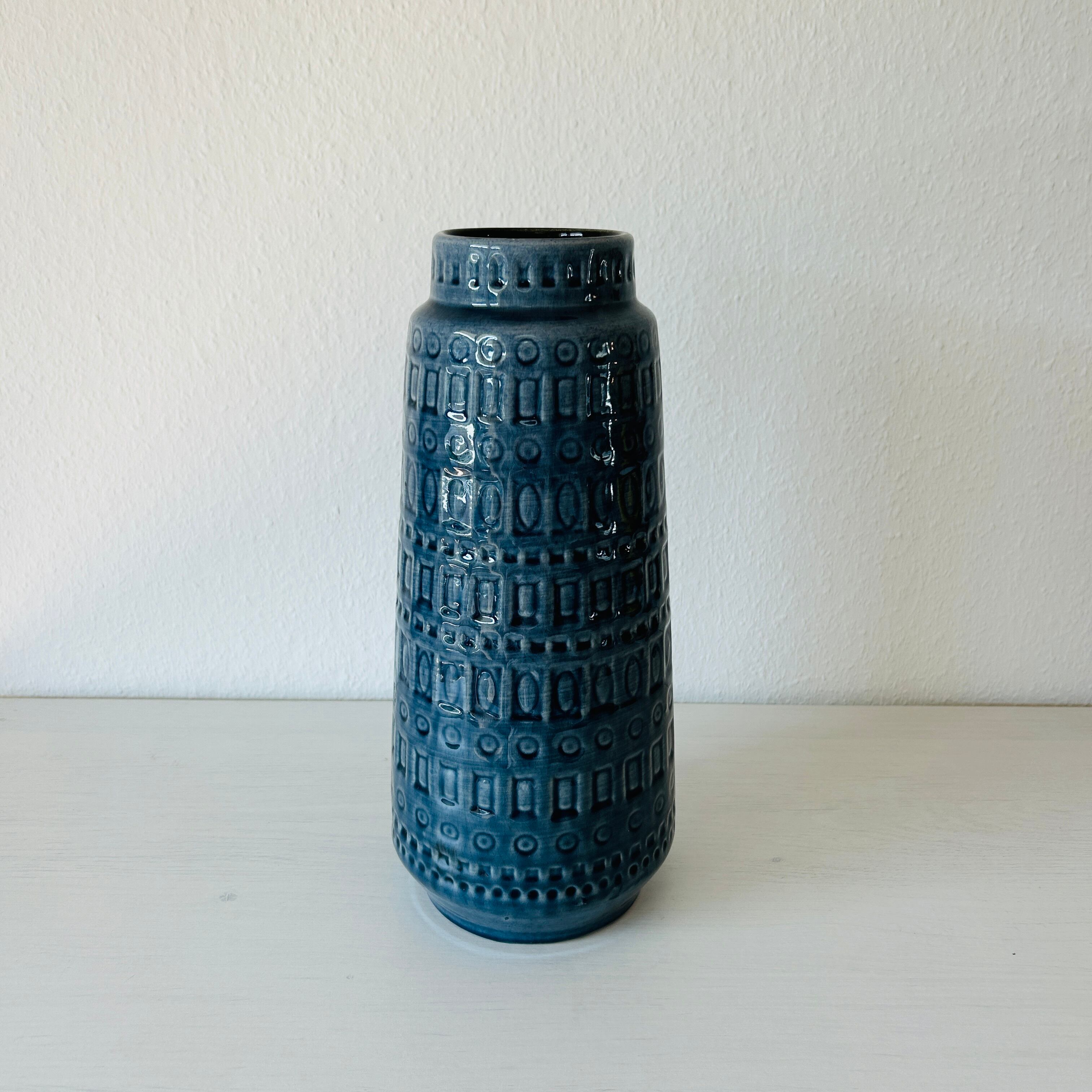 高さ30cmと存在感のあるサイズで、深みのあるブルーの釉薬が美しく光を反射し、幾何学的なレリーフ模様が立体感を引き立てています。1970年代らしいモダンで洗練されたデザインは、空間にアートピースのような重厚感をもたらします。花器としてはもちろん、オブジェとしても映える一品です。