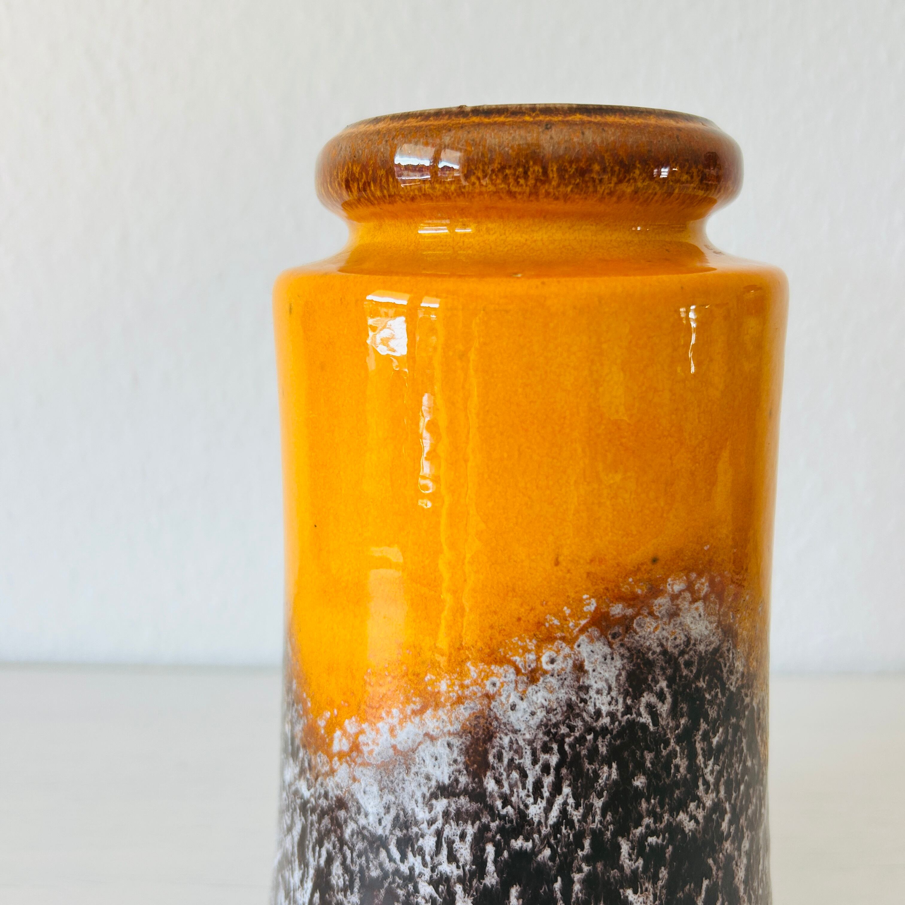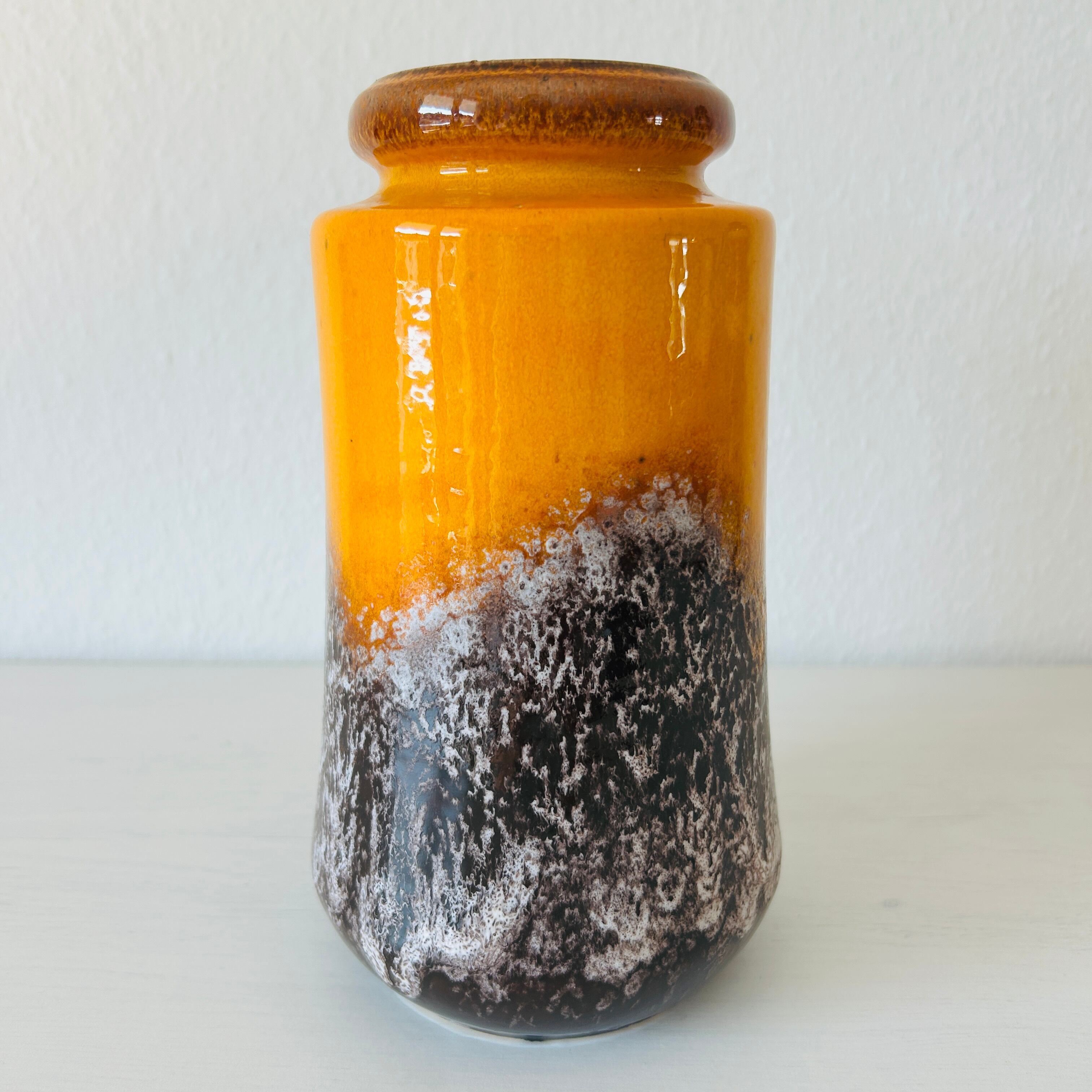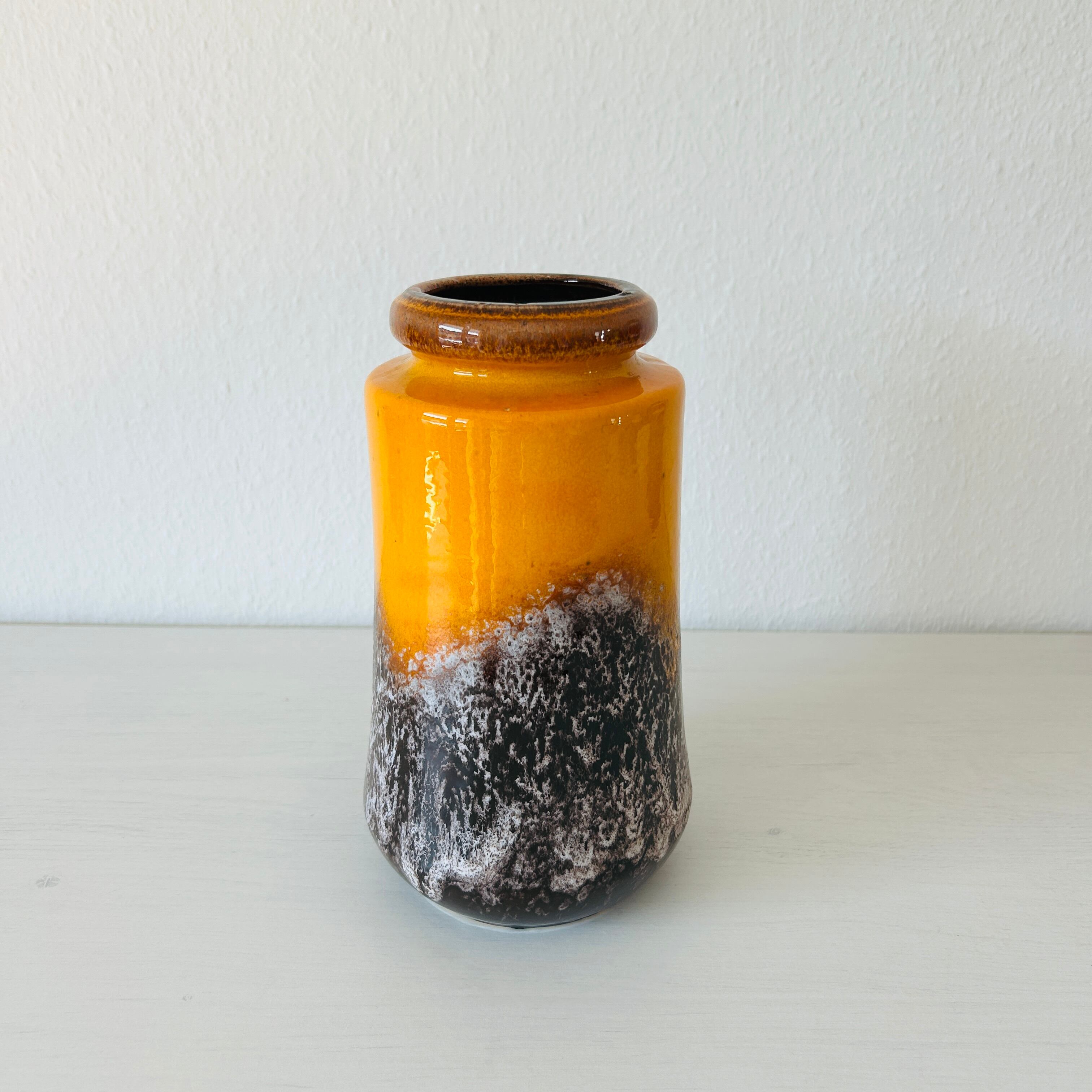 ミッドセンチュリー時代〜およそ1980年代頃までを中心にドイツ(大半は西ドイツ)で作られた、”Fat Lava”のフラワーベースです。当時の西ドイツでは”ファットラバ(脂肪/溶岩)”という独特な製法で多くの陶器が作られていました。その名の通り流れるごつごつした溶岩のようなデザインと鮮やかな色彩が特徴的です。幾何学模様、抽象的なパターン、大胆なフォルムなど、戦後の自由な造形美が表れていると言われています。
