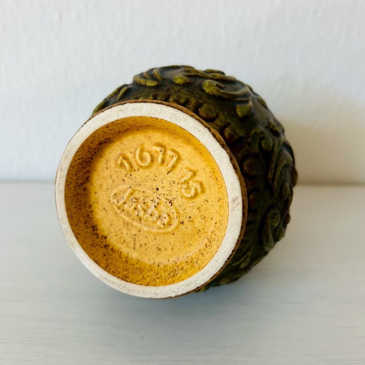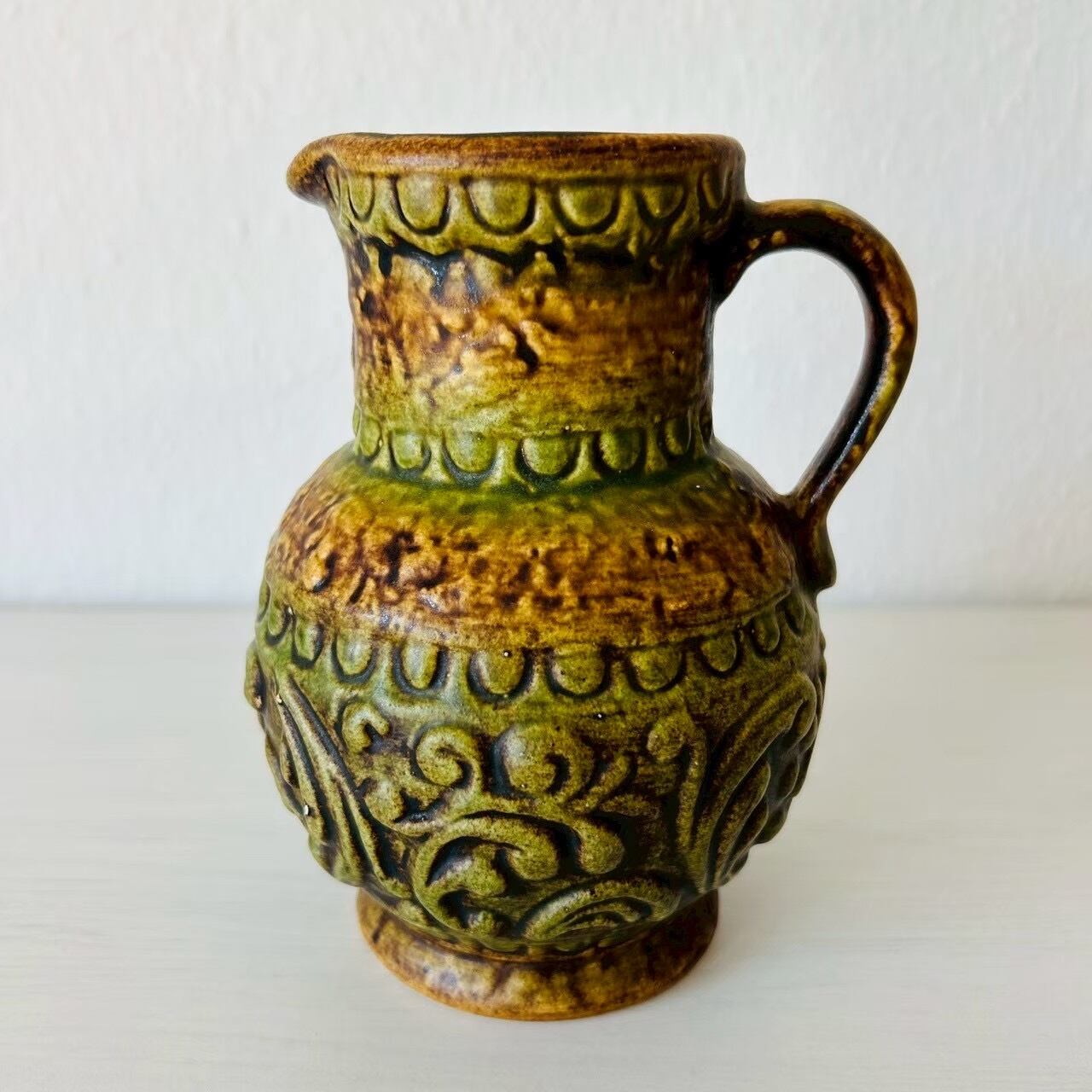 ミッドセンチュリー時代〜およそ1980年代頃までを中心にドイツ(大半は西ドイツ)で作られた、”Fat Lava”のフラワーベースです。当時の西ドイツでは”ファットラバ(脂肪/溶岩)”という独特な製法で多くの陶器が作られていました。その名の通り流れるごつごつした溶岩のようなデザインと鮮やかな色彩が特徴的です。幾何学模様、抽象的なパターン、大胆なフォルムなど、戦後の自由な造形美が表れていると言われています。