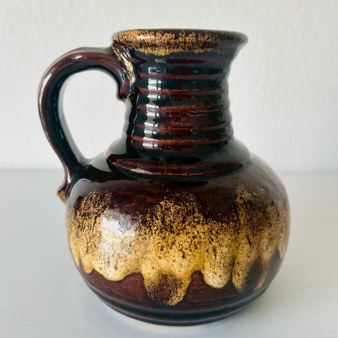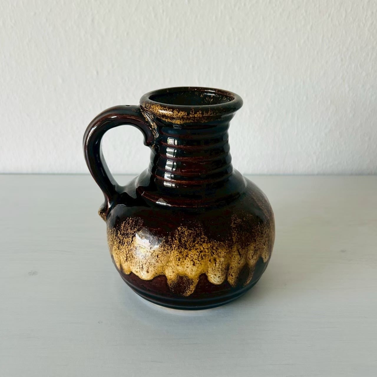 ミッドセンチュリー時代〜およそ1980年代頃までを中心にドイツ(大半は西ドイツ)で作られた、”Fat Lava”のフラワーベースです。当時の西ドイツでは”ファットラバ(脂肪/溶岩)”という独特な製法で多くの陶器が作られていました。その名の通り流れるごつごつした溶岩のようなデザインと鮮やかな色彩が特徴的です。幾何学模様、抽象的なパターン、大胆なフォルムなど、戦後の自由な造形美が表れていると言われています。