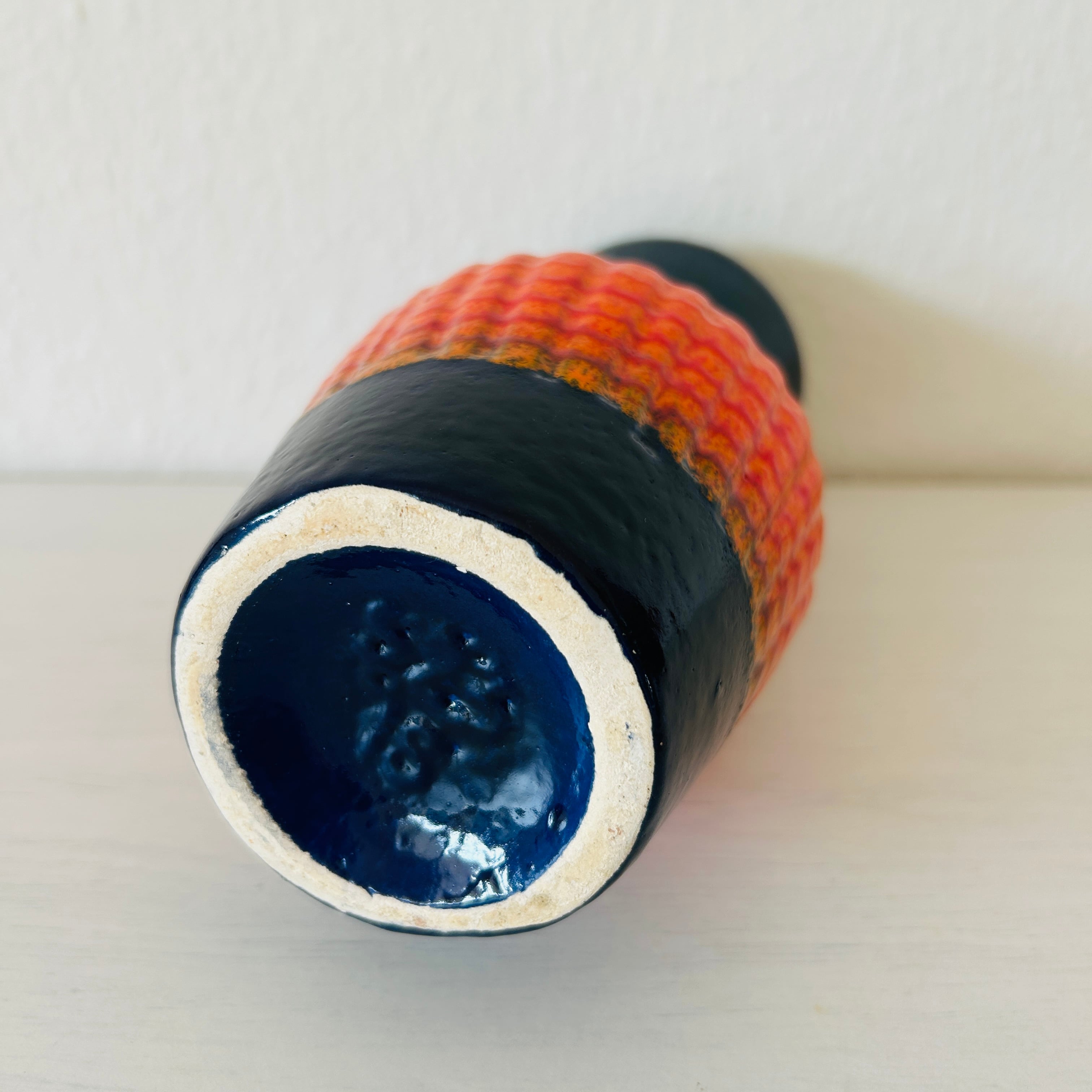 深みのあるネイビーのベースに、溶岩が流れるような立体的なオレンジの釉薬が重なり合い、見る角度によって表情が変わる印象的なデザインです。